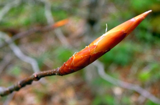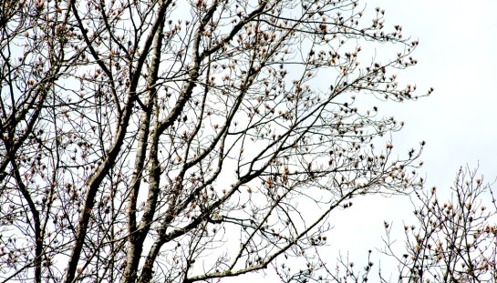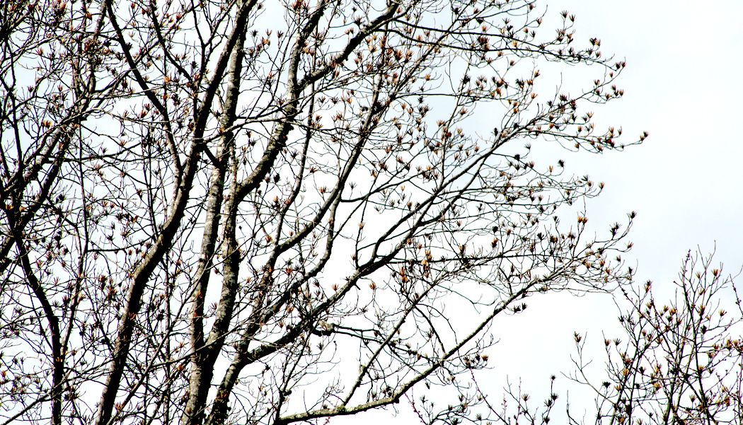 This is my favorite time of the year, when the bare trees begin budding at the twig tips. You can watch the trees change day by day, turning the dead sullen grey of December into something that clearly has a rising sap under the dull bark. When you watch the buds close up, their bud scales slowly separate, with thin lines of green beginning to spread at the edges.