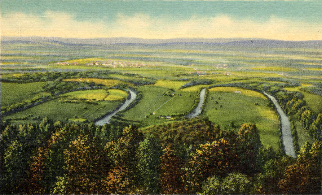 The Shenandoah Valley separates the Blue Ridge in the east from the great ridges of iron- and coal-laden mountains to the west. The river rises in twin forks, one on either side of Massanutten Mountain, which rises like a long, low bread loaf in the middle of the valley.