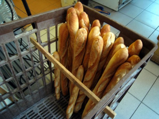 Behind the counter, baskets stuffed with baguettes, like arrows in a quiver.