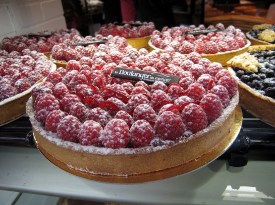 On one side of the door are shelves filled with some of the most scrumptious pastries: tart de framboises, tart de pomme, raisin horns, tiny chocolate tarts with a surface so deep and brown and so smooth you would swear they were varnished.