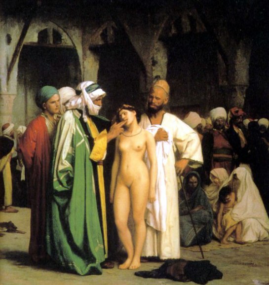 And it comments on such popular paintings of Manet’s time as Gerome’s “Slave Market,” in which clothed men paw over a nude woman, checking her teeth before purchasing her.