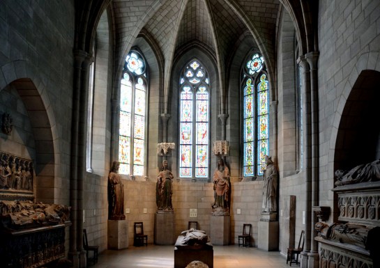 In the center of the chapel is the tomb of the chevalier Jean d’Alluye, who died in 1248. On top of the sarcophagus lies the effigy of the knight, with his palms pressed together in prayer and his chain-mailed feet resting on a small stone lion. Jean had been to the Holy Land during a crusade in 1240 and had brought back what he believed was a piece of the true cross. He was originally entombed at the abbey of La Clarte-Dieu, near Le Mans, which he had built in 1239.