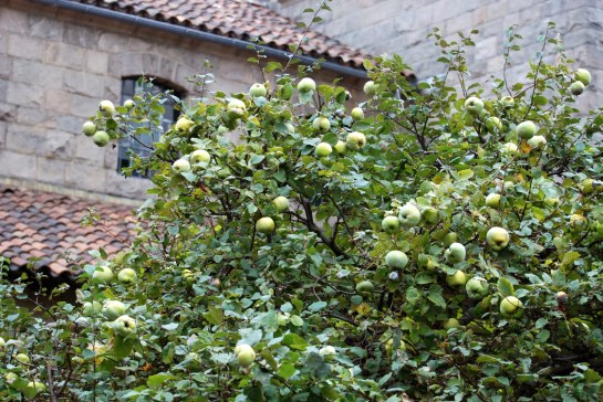 In October, the quince are ripening to a mottled yellow, looking something halfway between apples and pears. Their subtle fruity smell is exquisite.