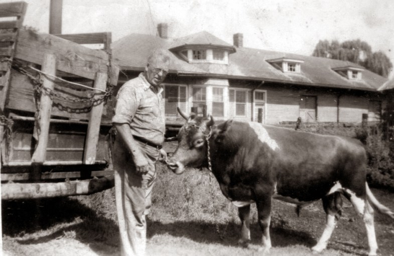 Earl Thaddeus Steele and his pet bull Bucko. On day Bucko is being taken to the abattoir because he was wild and tried to kill poor little Carole.