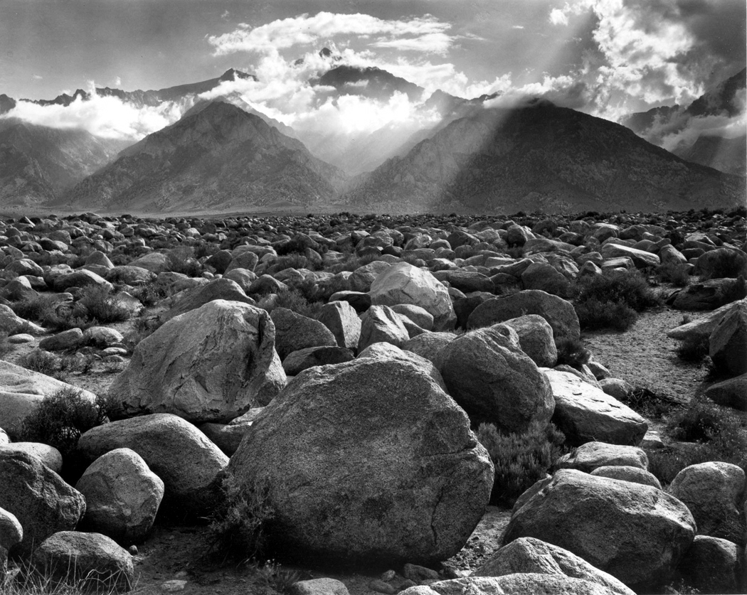 And the single most famous image from Adams’ time in the camp is his Mount Williamson, Sierra Nevada, from Manzanar, California. It was prominently featured in the Museum of Modern Art show ”The Family of Man” in the 1950s, with its foreground of gargantuan boulders and background of sunlight breaking through a storm over the mountain peak. If ever there was a photograph meant to evoke the spiritual power of landscape, this is it.