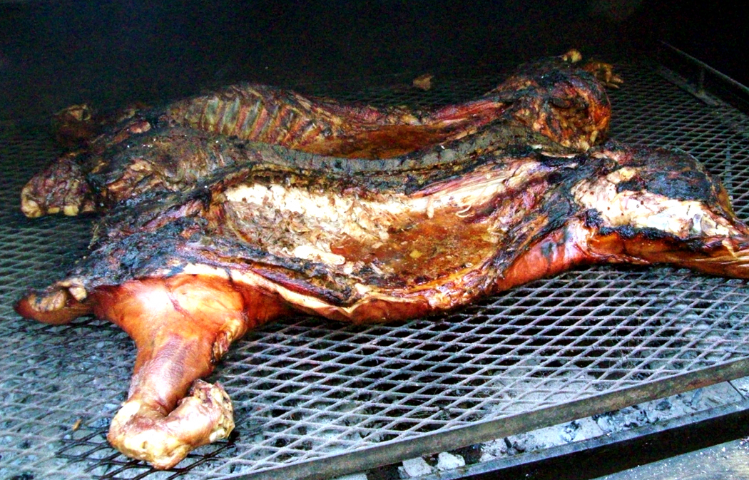 Nearby was a cinderblock pit with a hog splayed out with its opened belly cavity spread flat on the rack over the hickory coals glowing with white-hot heat. One elder, in another ballcap, was tending to the pig, brushing it every while in a once with a sauce that seemed to help crisp the fat.