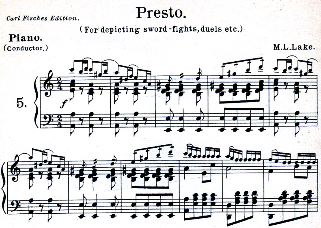 In 1919, Giuseppe Becce published his Kinobibliotek, which was a volume of musical chunks each matched to an emotion or action likely to be encountered in a film. One might be titled, Pursuit, and another, Tender Agitato. Universal Studio came up with its own, assembled by Max Winkler, who borrowed freely from classical music, excising snippets of Beethoven or Bizet to be played by the house pianist at the appropriate moment in the film. Winkler actually made up lists of tunes for each film Universal released, matched to the cues in the plot. “J.S. Bach’s immortal chorales became Adagio Lamentoso for sad scenes,” Winkler wrote. Beethoven provided a “Sinister Misterioso” and Tchaikovsky a “Strange Moderato.” Mendelssohn’s familiar Wedding March was used for weddings.