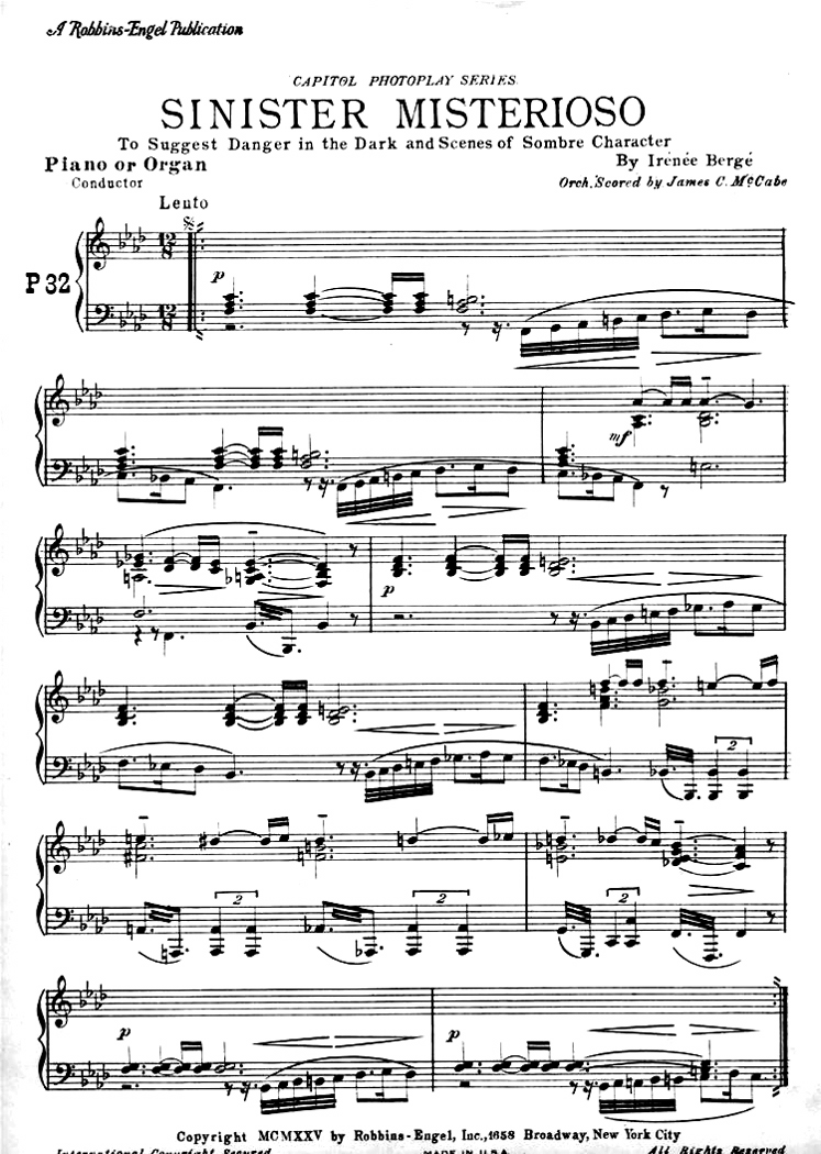 The problem was that not every film was Birth of a Nation, and not every movie house could afford an orchestra. A full score might be fine for New York City, but when the movie went to Dubuque, a cheaper alternative was needed. So, most Roxies and Paramounts across the nation relied on pianists and organists. For an “A” picture, they might rely on piano reductions of the full score, provided by the studios, printed on cheap paper and distributed with the films along with such other promotional material as posters and blocks for newspaper ads. But for a “B” picture, the pianist either improvised on the spot, or relied on one of several “cheat” books.