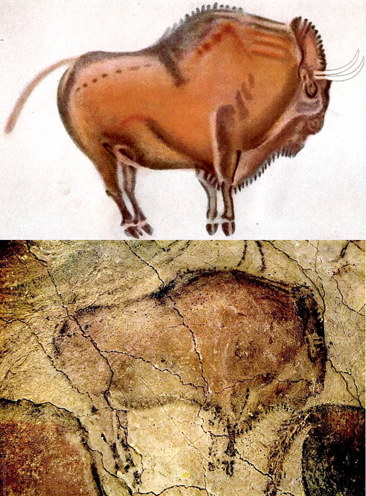 Often, in books, the images we see of cave paintings are not photographs of the original, but reproductions of drawings made of them. Abbe Henri Breuil, for instance, made many of them. He was one of the first and most influential archeologists to study the many cave paintings in France and northern Spain. But his drawings often make the originals clearer and of higher contrast. And we cannot always know if he has given us a perfect copy, or a modern interpretation.