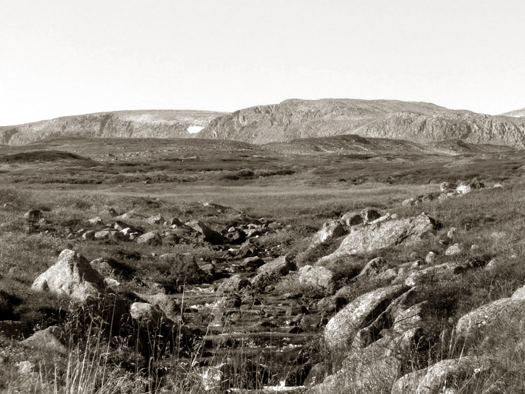 We climbed up granite cliffs and over plateaus marshy with meltwater. When we reached the highest point on the hike, we stopped for lunch. Lars unloaded the wood he’d been carrying, scrunched a few rocks together and built a fire on which he balanced his coffeepot.