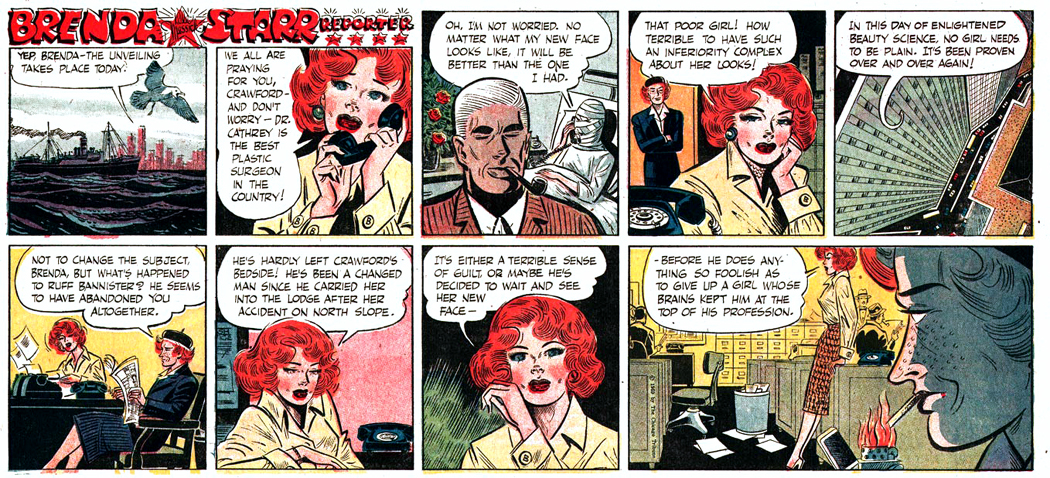 Compare that with an even middle-quality strip from the 1950s, like Brenda Starr and see the difference. There are establishing shots, like in the movies, there is the splendid perspective shot looking down the skyscraper. Many panels include two or three points of interest, causing your eye to move, say, from the telephone in the foreground to our heroine behind it and finally, her pal, Hank O’Hair, coming in the door in the back.