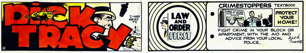 There was a period in the mid-’60s when Tracy got weird. Or weirder, I should say. Junior Tracy married Moon Maid and the first interplanetary child was born: Honey Moon. Tracy and the police force floated around the city in anti-gravity trash cans. There were the Stop-Action Laser Gun, the atomic light and Diet Smith’s Space Coupe. And the two-way wrist radio gave way to the two-way wrist TV. The quintessential cops-and-robbers comic strip was going sci-fi.