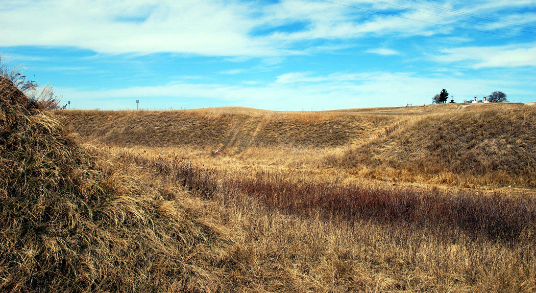 The dusty ground at Wounded Knee is a gully with the bridge on one side of the road, and a hill with the Indian graves on the other. During the battle, troops had placed cannons on the hill and lobbed exploding shells down the slope at the Indians.