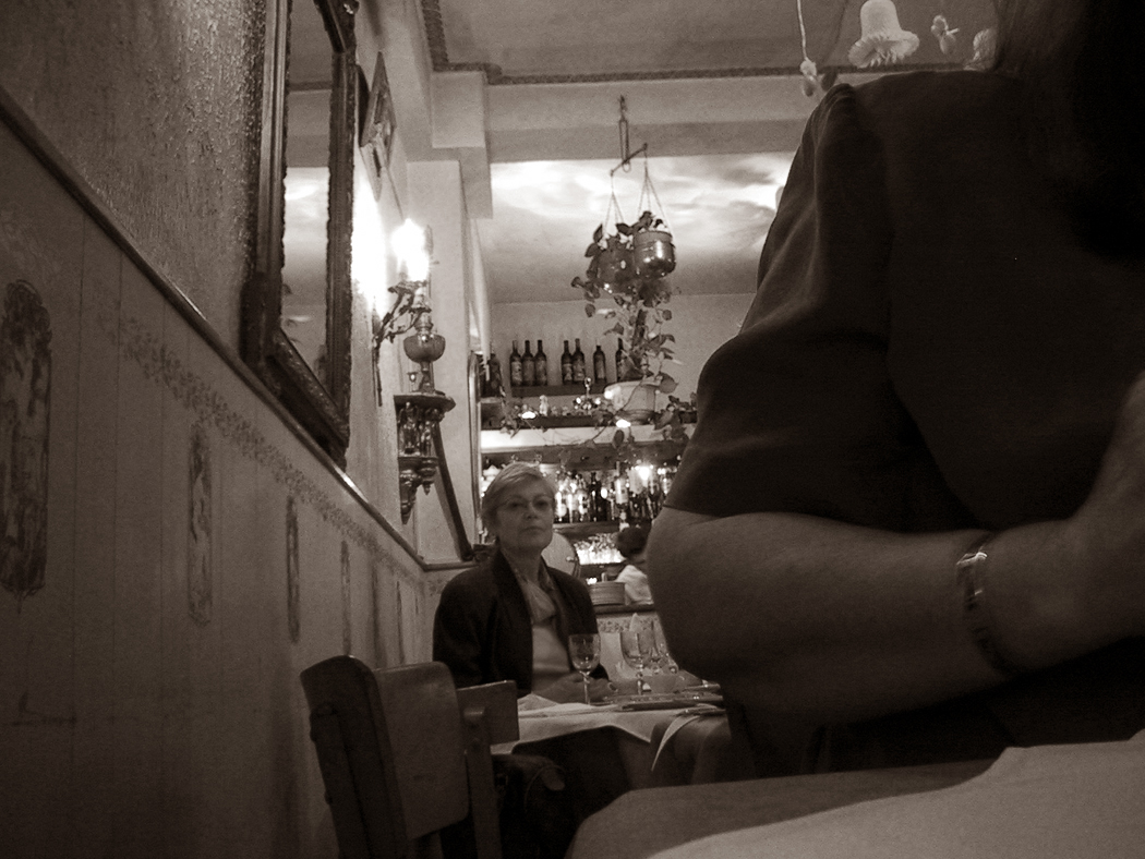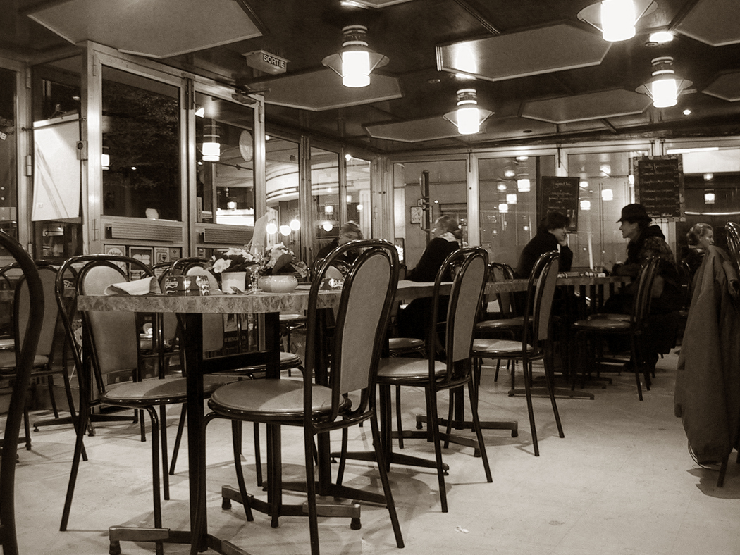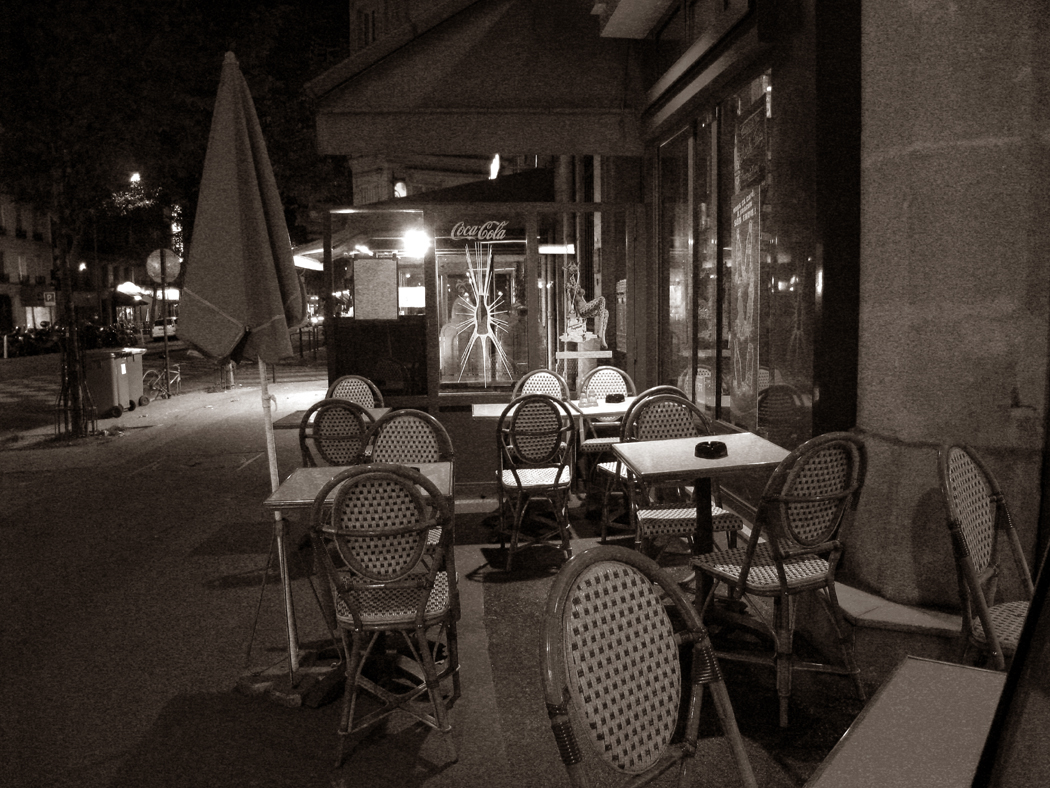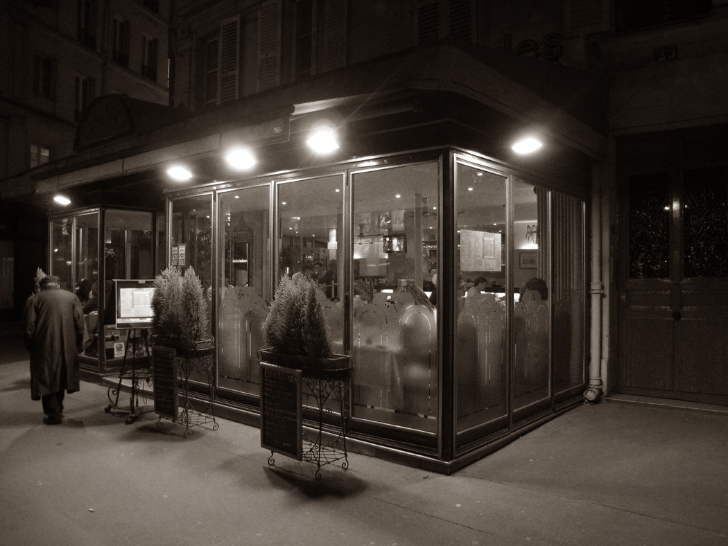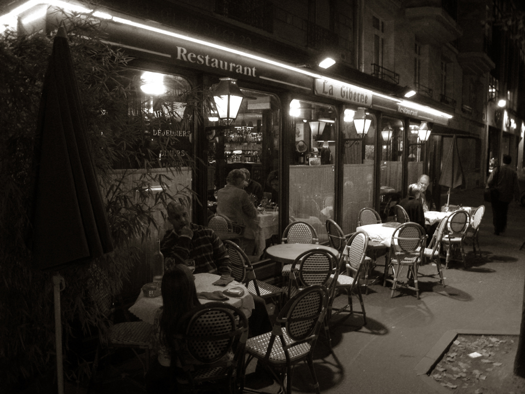 Even the sound is different at night. Like the campfire, the sound is huddled, localized. In this restaurant, the sound is held in by the walls and front window. Outside it is silent once again.paris night 11x
