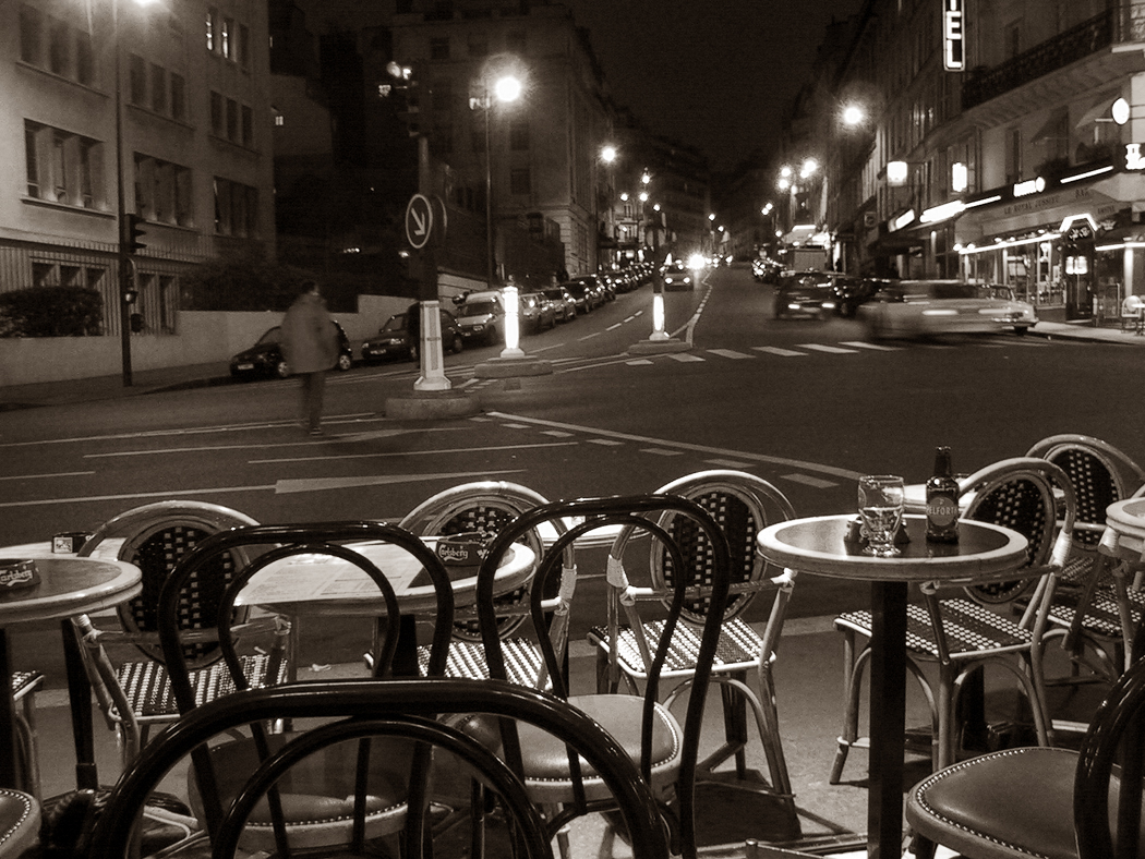 When I think of Paris, I think of it at night. I hear the voices and see the maitre pulling the Stella Artois from the tap. Most of the seat are empty and those filled are on the way home after a night at the cinema or theater. They may stop at the 8 a Huit for a pack of cigarettes. (Say it like “wee-a-wee,” it is the French equivalent of a 7-Eleven, only tighter packed and with one wall covered with wine bottles. The man sitting by the cash register is Algerian and tired after spending 12 hours in his shop.)paris night 13x