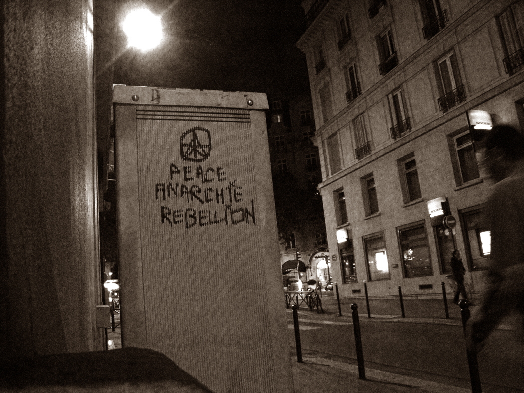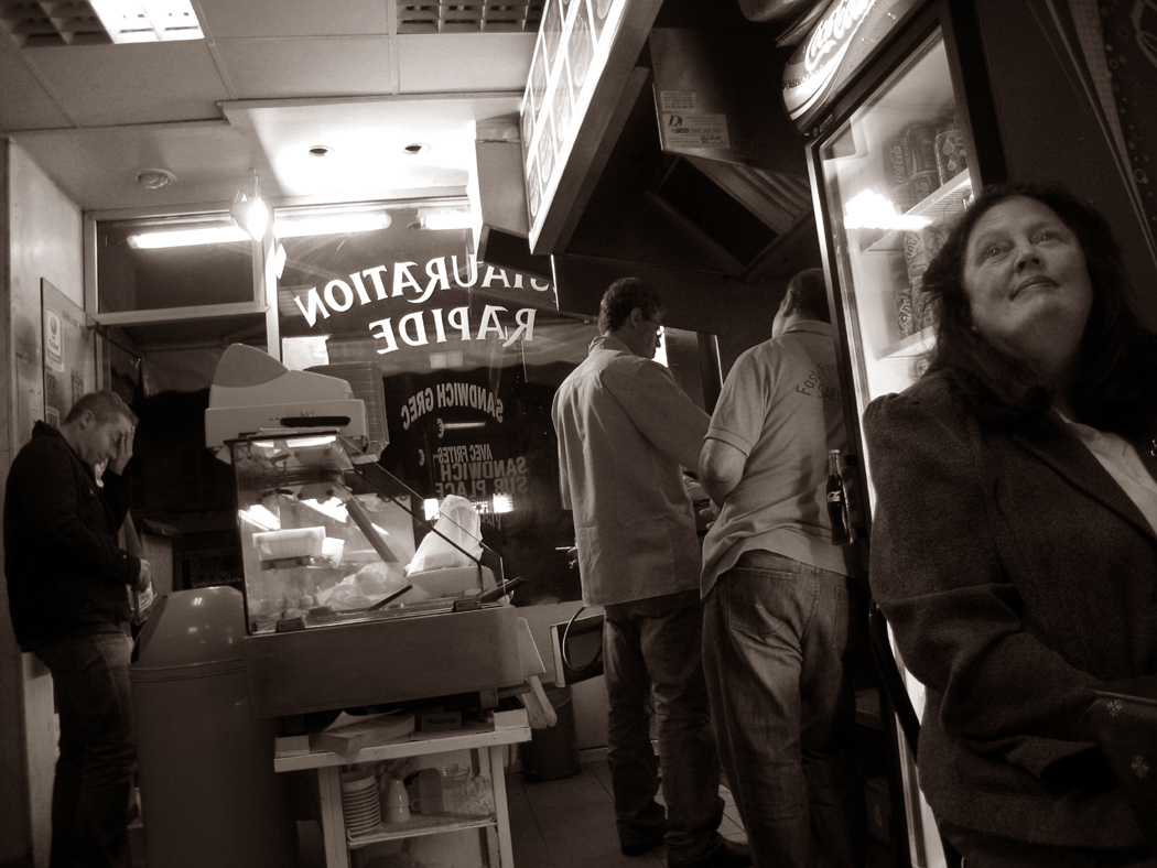 You wander into a Turkish souvlaki restaurant, a cheap storefront halfway down the street, and the man behind the counter is on the phone speaking some language you don’t know — it isn’t French — and he smiles at you as you sit on the molded plastic chair with the rocking table between you and your wife. The wall is bright yellow behind the glass counter, with garish purple writing offering the usual fare, lit with a glare. Gyros, souvlaki, pilaf. It is warm inside, and humid and the food is comforting.paris night 10x