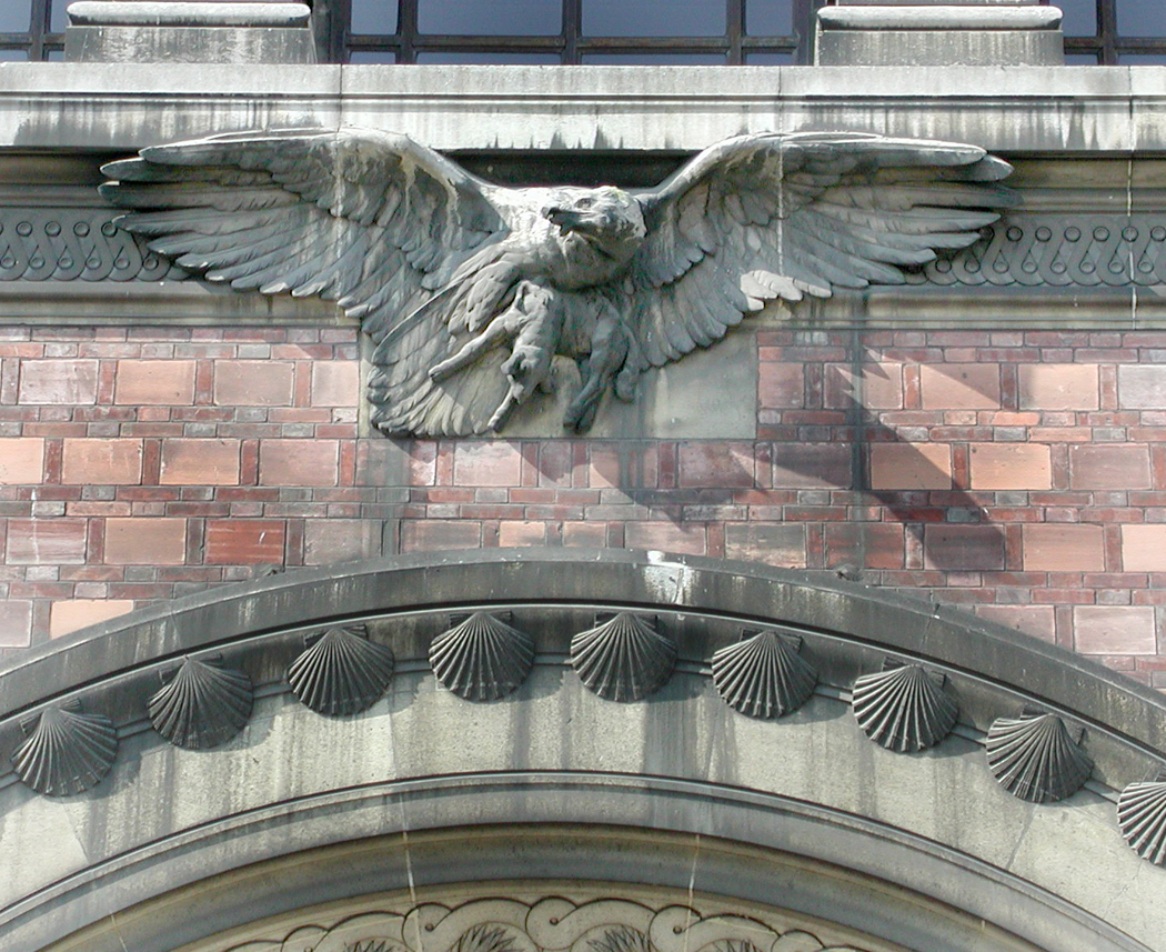 But the building itself is notable. It is decorated on all sides with the most beautiful and decorative sculpture of the natural world. As an underpinning to window sills there are lobsters, hermit crabs, birds. In panels along the side of the building are giant wolves and lions. Above the entrance is a great eagle holding a lamb. A frieze completely bands the building with alternating scallop and vollute shells. Another panel on the west side has a beaver. Yet another has a scene with a man grappling with a bear cub over the dead body of its mother. Another had two men stealing young eaglets, having killed one adult, but with a second adult attacking the men.