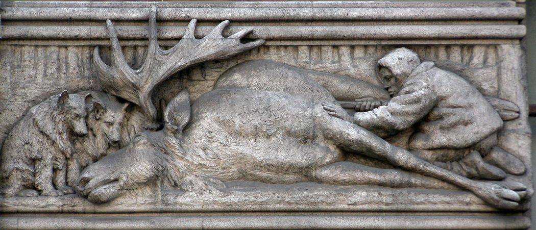 The sculptor Constant Roux (1865-1942) designed a ribbon of sculpture around the building depicting “Primitive Man.” And it is an impressive display of invention and design. It is also a reminder of the pernicious racial ideas prevalent in anthropology then current. Roux has divided primitive peoples into racial groups, African, Asian, American Indian, Oceanic and Caucasian. For the Caucasians, “primitive” meant prehistoric, so his Caucasian examples are so-called “cave men.” For the others, his primitive peoples are contemporary, or at least existed within the past 100 years — like the Indians he sculpts stalking their prey in the skins of animals.