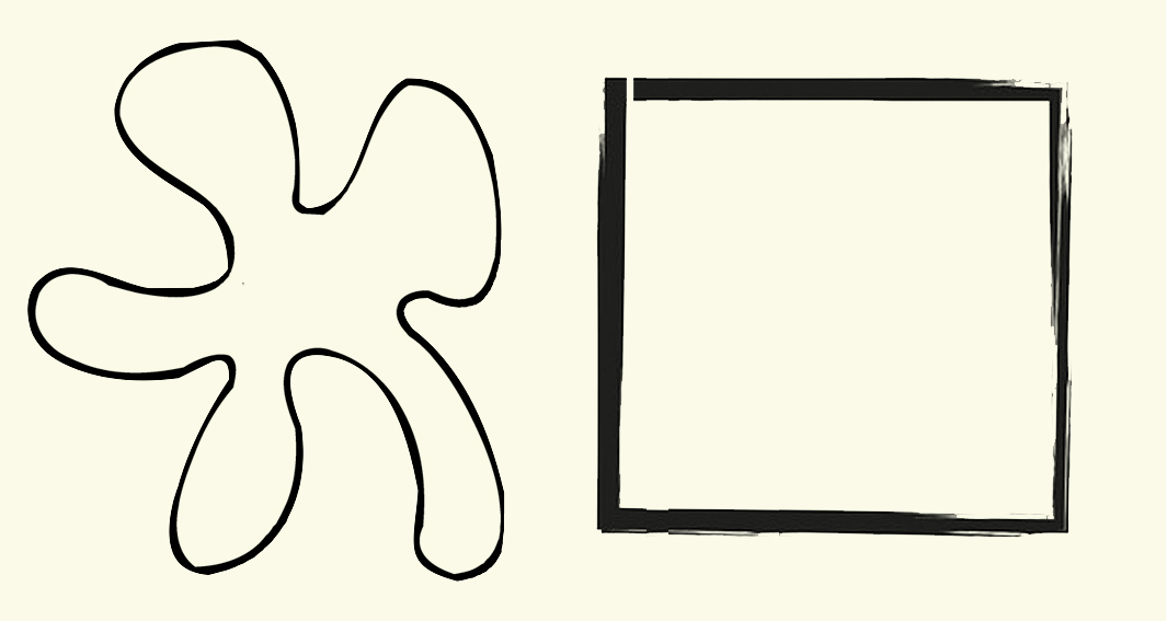Notice that the square here is not a perfect square. It has some sketchy lines and it is not completely closed up, and, in fact, it isn’t even a square, but a low-aspect-ratio rectangle. All of that visual information is expunged when you replace it with the name, “square.” The amorphous shape, on the other hand, would require you to look at it and attempt to follow its contours with your pen, forcing you to pay attention visually.