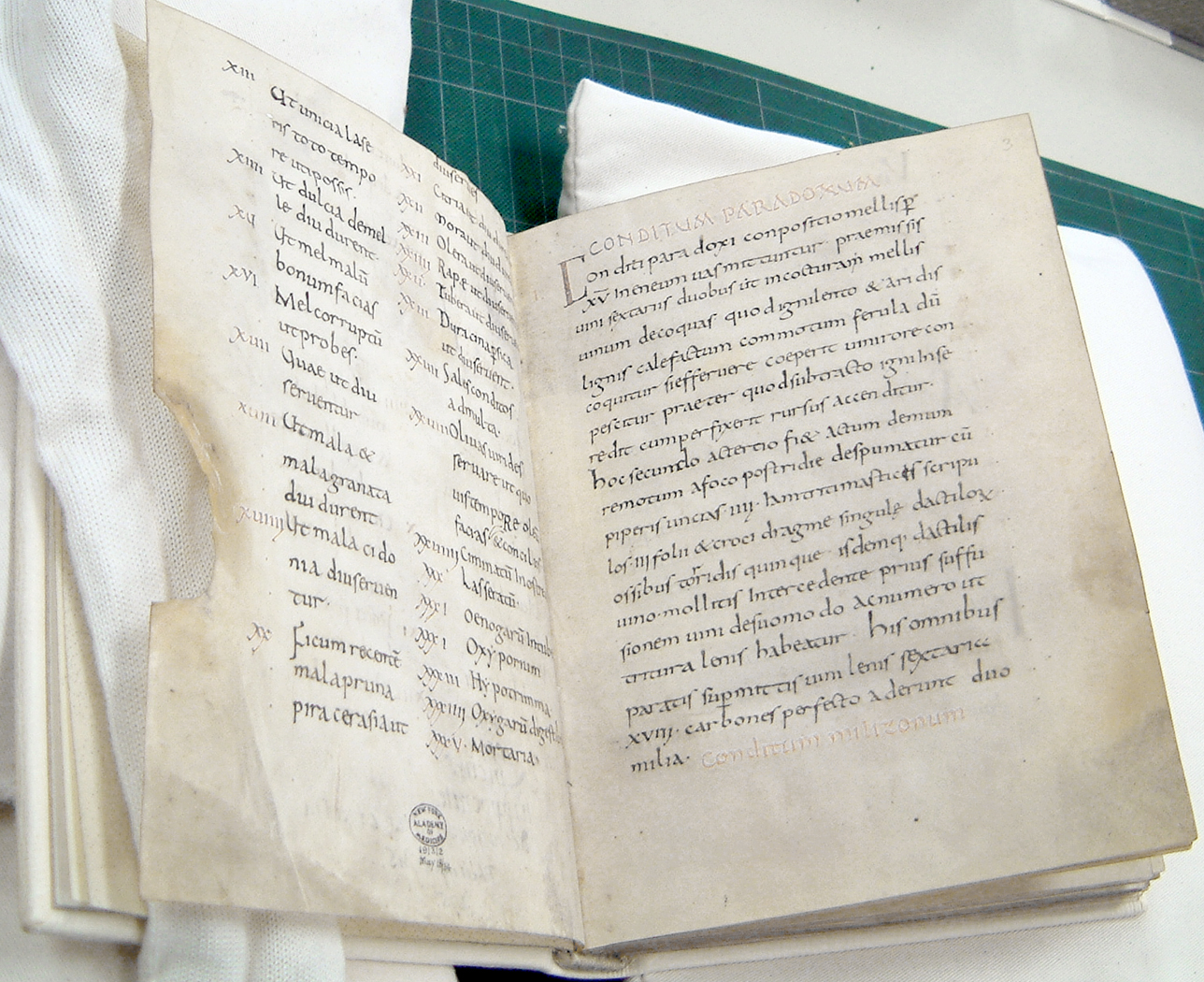 One recipe begins: “Sawse madame. Take sawge, persel, ysope and saueray, quinces and peeres, garlek and grapes, and fylle the gees therwith; and sowe the hole that no grece come out, and roost hem wel, and kepe the grece that fallith therof.”