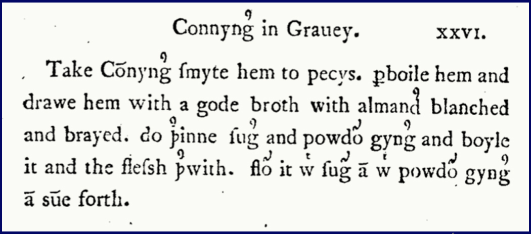 Translated, it reads: “Take rabbits, smite them to pieces. Parboil them and draw them with a good broth with blanched and brayed almonds. Do therein sugar and powdered ginger and boil it and the flesh therewith. Flour it with sugar and with powdered ginger and serve forth.”