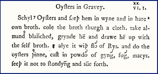 I love that “smite them to pieces.” The language has an almost biblical feel to it. Another recipe says to “Shell the oysters and seethe them in wine and in their own broth.”