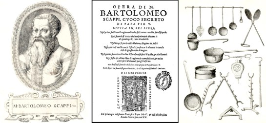 In 1570, a second Bartolomeo came out with his cookbook, both printed and in ordinary Italian. It was the Opera dell’Arte del Cucinare, or “Works on the art of the kitchen,” by Bartolomeo Scappi (1500-1577), who was chef to three popes. It continues the old tradition of exotic spicing, but it is the first cookbook to include illustrations.