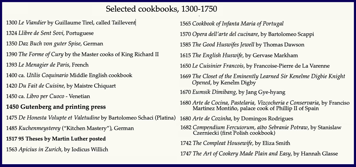 It needs to be remembered that until 1450, all cookbooks were written in manuscript and copied when needed. Their reading public was limited by the literacy of the populace when only the very few could “reckon letters.” And so, those cookbooks were aimed at the kitchens of the wealthy and aristocratic, and their instructions were given to those who already knew the basic techniques. The cookbooks rarely mentioned quantities or explained widely understood preparations.