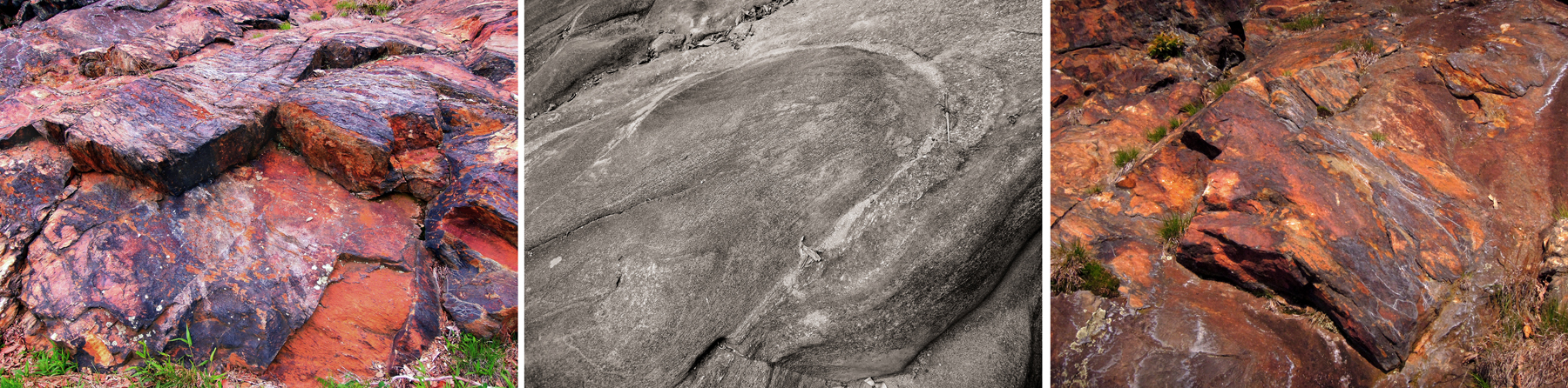 And the new dimension changed my approach to photographing stone. At first, I sought out the garish, like these rocks along the Blue Ridge Parkway, stained with iron rust.