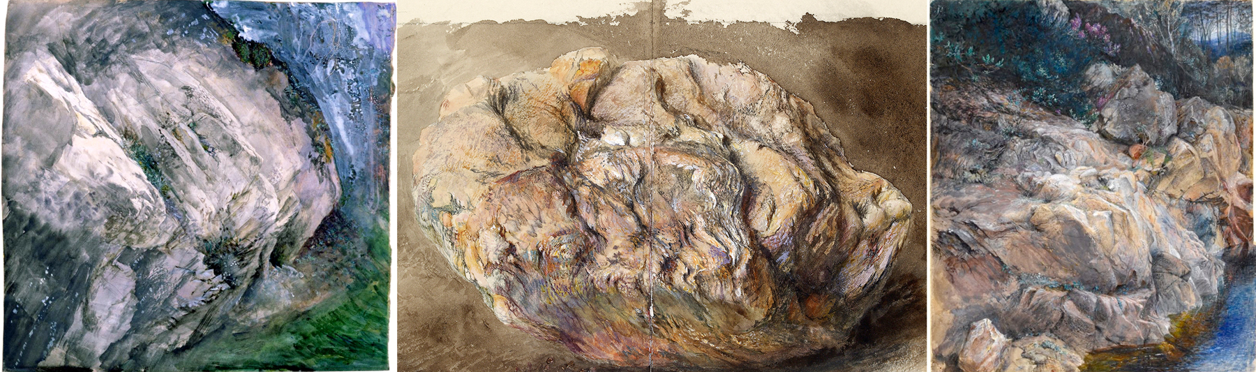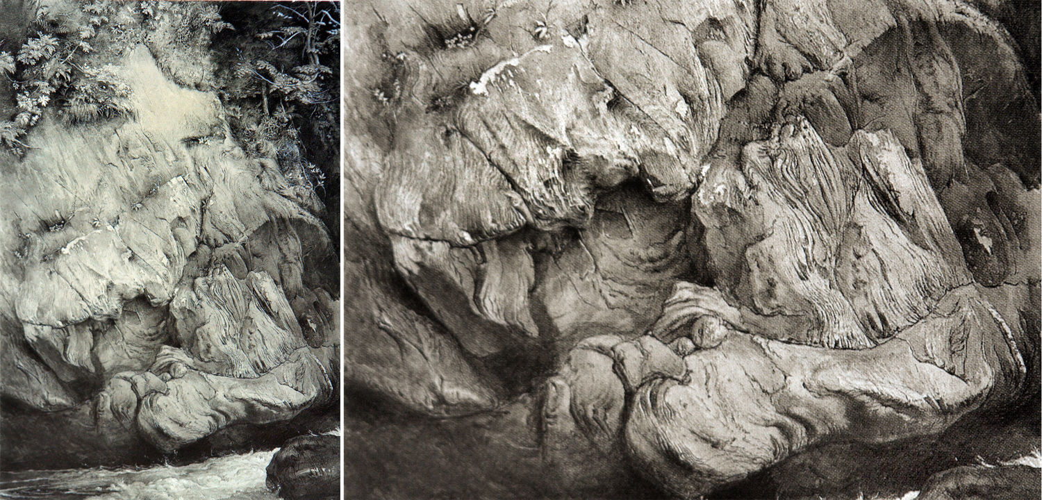 And rocks. Stone carved and molded, left striated and torn by time and weather. Many of Ruskin’s drawings are of stone, or rocky outcrops.