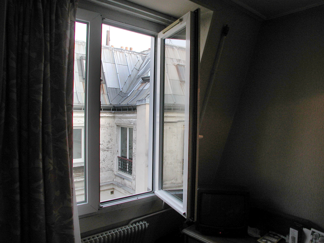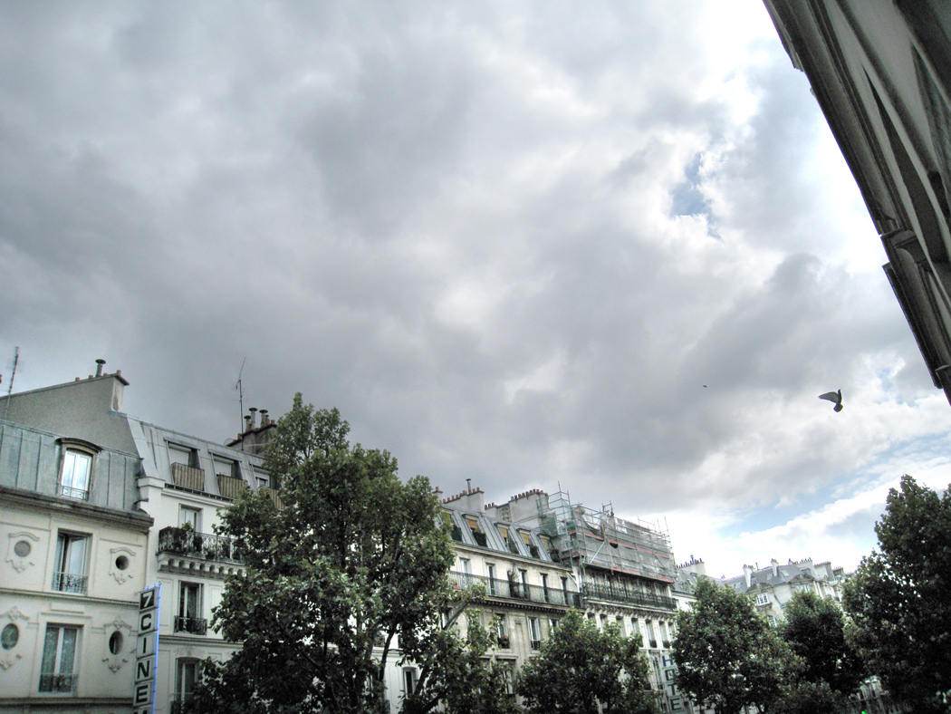 Paris is an oddly layered city, with the newest on the bottom and the oldest above. Almost every building houses some modern shop on the ground floor, with neon lights, plate glass and corporate logo. While from the second floor upwards, you see the old wrought-iron balconies to the small casement windows, peeling paint, rotting plaster or concrete, and surmounted by a gaggle of chimneys, each with a half dozen flues poking out the top.
