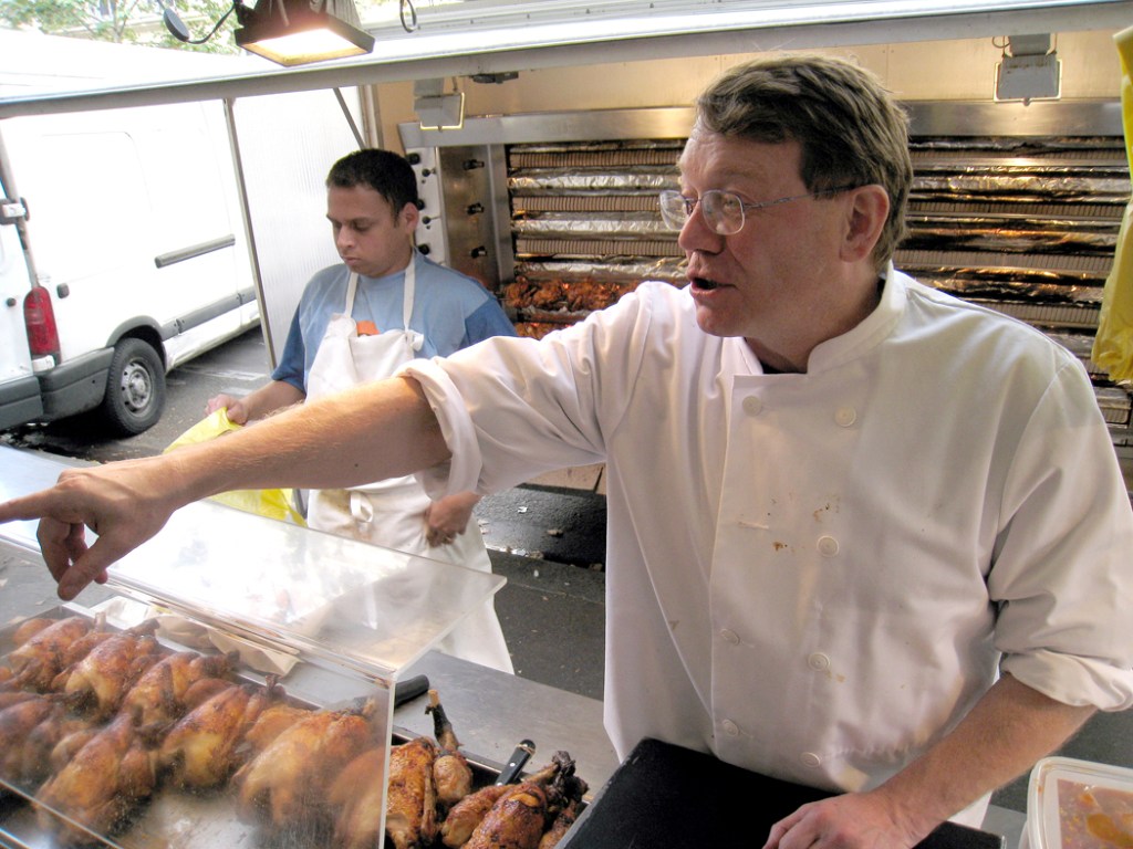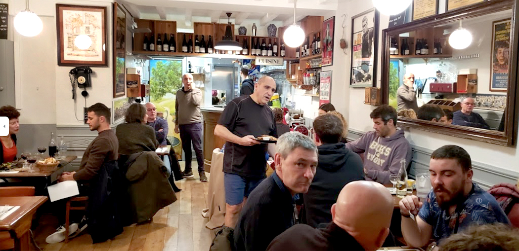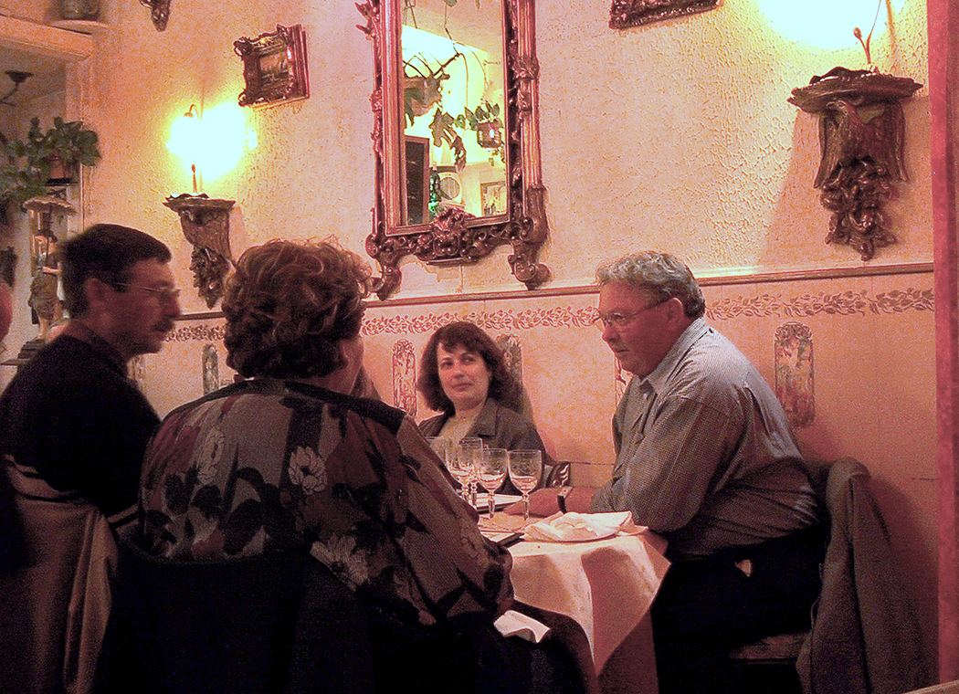 On our first visit together, in 2002, we ate at Le Physicien, a Basque restaurant at the far end of rue Monge. It was group seating, and we were at a long table with a bunch of students. They had such a ball, it was infectious. They sang and drank and ate. Carole shared her braised kidneys with them. They shared shrimp with her. We had a piperade — a Basque specialty with garlic, onion, peppers and egg — that was the highlight. Daniel, the chef and owner, smiled on us all with his aged, whiskered smile.