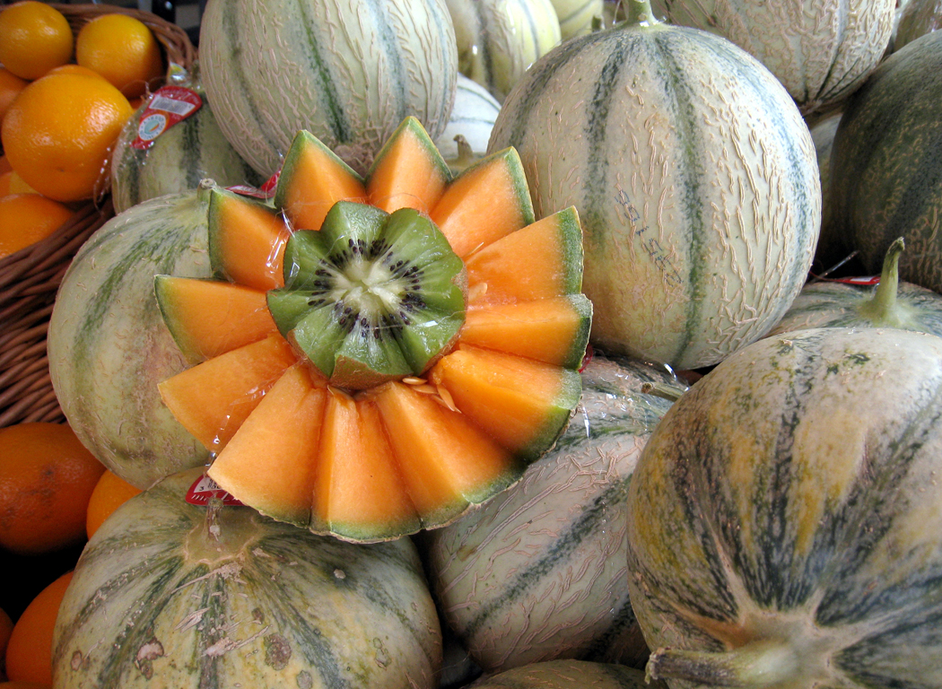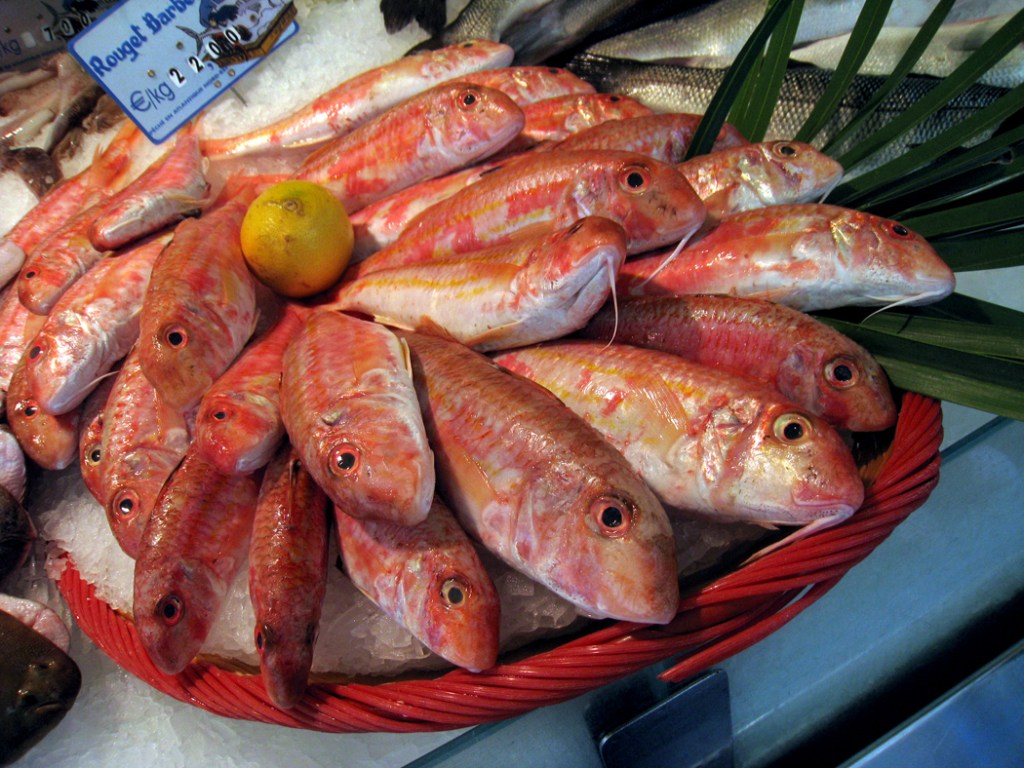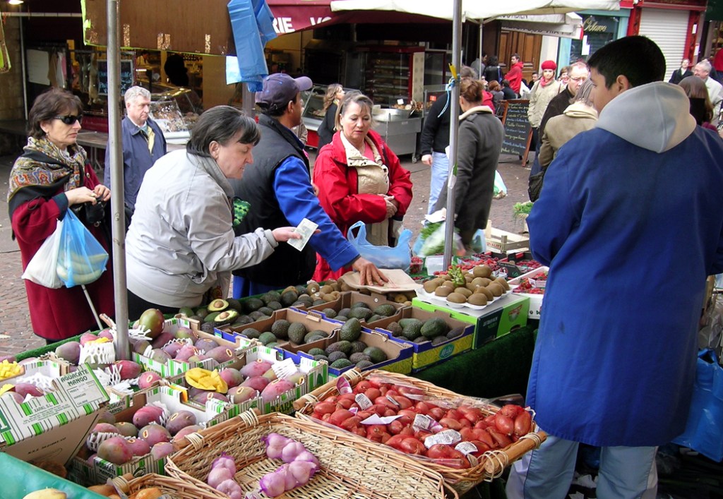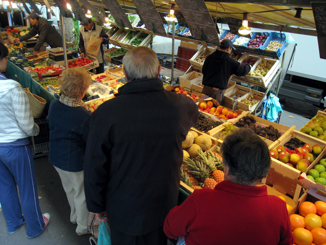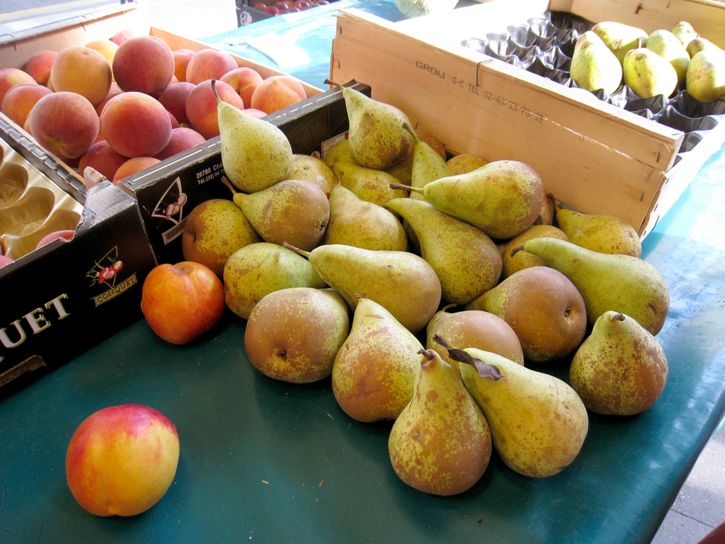The market sits under canvas tent-roofs along the sidewalk, with the territory divided up between vendors. One was a fishmonger, with heaps of silvery dace and mackeral, red-fleshed, skinned flatfish, piles of oysters, boxes of shrimp and langoustini. The next had meat, with freshly butchered shanks and steaks, and platters of livers, kidneys and other oddments. More than one stall was end to end vegetables and fruits, with cauliflowers, tomatoes, leeks, cabbages, peaches, apples, pears.