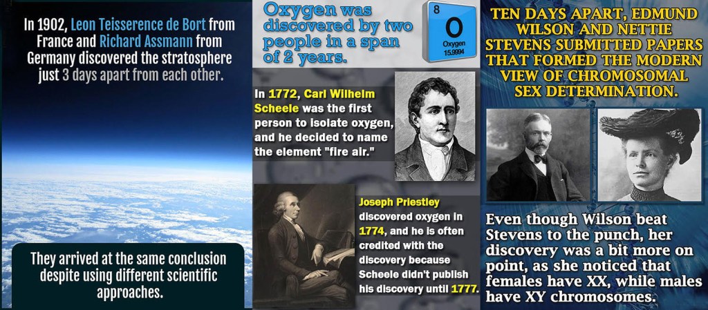 Joseph Priestly and Carl Wilhelm Scheele discovered oxygen both in the 1770s. Both Nettie Stevens and Edmund Wilson submitted papers that formed the modern view of genetic gender determination 10 days apart. Takaaki Kajita and Arthur B. McDonald independently proved neutrinos have mass. Lothar Meyer and Dmitri Mendeleev each created the periodic table of elements — a year apart. The British Frank Whittle and the German Hans von Ohain each came up with the first jet engine, during World War II, on opposite sides of the conflict.