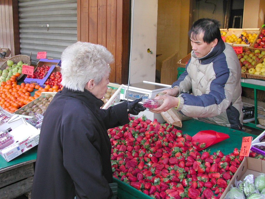 Then, more food. One great-smelling stall had whole chickens on rotisserie racks, about 6 skewers high, over a trough with golden roasted new potatoes. He called to us in English, “Take home a half chicken, only 3 Euro.” I shrugged my shoulder: We had nowhere to take such a succulent morsel.