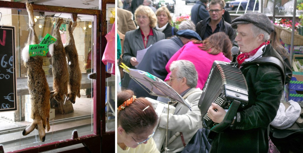 It was like something from a movie, or a travel poster, with hundreds of vendors selling vegetables, fruits, meats, fish and all kinds of viands. Up and down the narrow street, shops offered oysters, coffee, bread and beer. On shop had freshly-dead rabbits hanging in the window. “Lapin — 8 Euro, Lievre — 10 Euro.” The hare was about 20 percent larger than the rabbit.