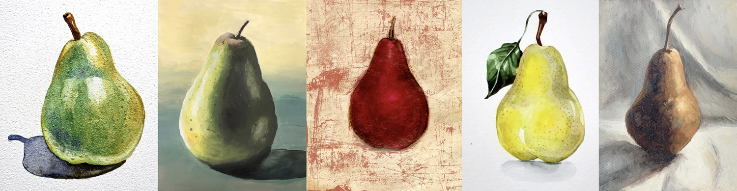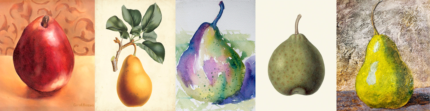 But a pear can be seen with less baggage. It bruises more easily than an apple, yet its pulp is firmer, stiffer, unless overripe, when it can go mushy. Nor is it as sweet as an apple, although we must point out that there are hundreds of different varieties of apple and that a red delicious is sweeter than a granny smith. (Yet the granny smith makes a better pie).