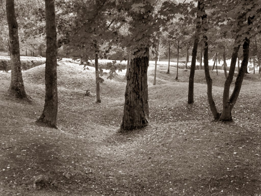 Perhaps I should not say that the earth does not remember. It can, in certain ways. Visiting the woods of Verdun I saw the uneven forest floor, where the shell craters have only partially been filled in. Once the trees were flattened by artillery, leaving the moonscape littered with corpses. The trees have grown back, but the craters are still discernible in the wavy forest floor.
