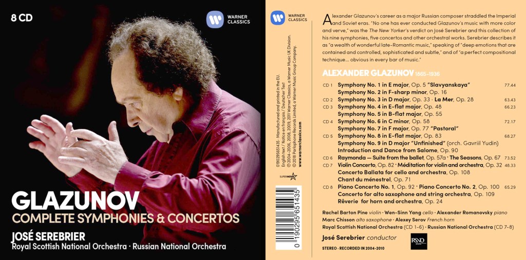 For his symphonies and concertos, there is an inexpensive box set on Warner Classics, conducted by Jose Serebrier that is, I think, the best currently available set. There are other versions with Vladimir Fedoseyev and the Tchaikovsky Symphony Orchestra of Moscow Radio, in somewhat lesser sound engineering; and Naxos has its series of Glazunov’s music, with the symphonies conducted by Alexander Anissimov and the Moscow Symphony Orchestra. Serebrier beats them all with sound, performance and price.