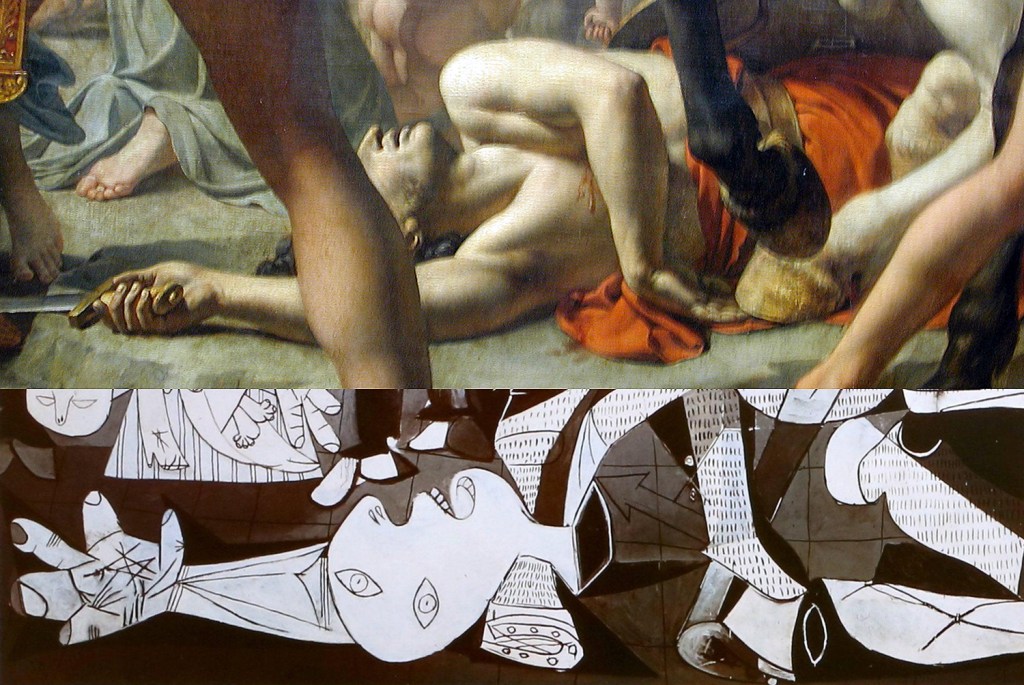 (See how the fallen soldier in Jacques-Louis David’s Intervention of the Sabine Women echoes in Picasso’s Guernica. One way of looking at all cultural history is as an extended conversation between the present and the past. The reverberations are loud and clear.)