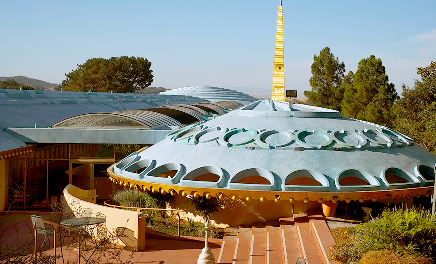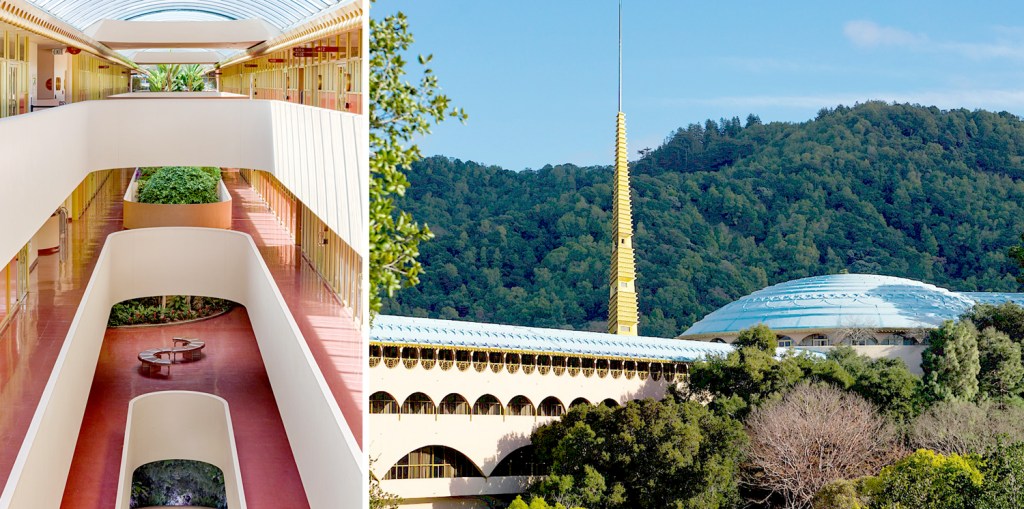 The shopping mall concept, it can be argued, began with a government building by Wright. In 1957, the equivalent of a Steven Spielberg “mother ship” landed on a woody hillside in San Rafael, Calif. It was the Marin County Civic Center and, from the outside, it was one of Wright’s “Planet Mongo” designs — odd, ungainly and a model of kitsch.