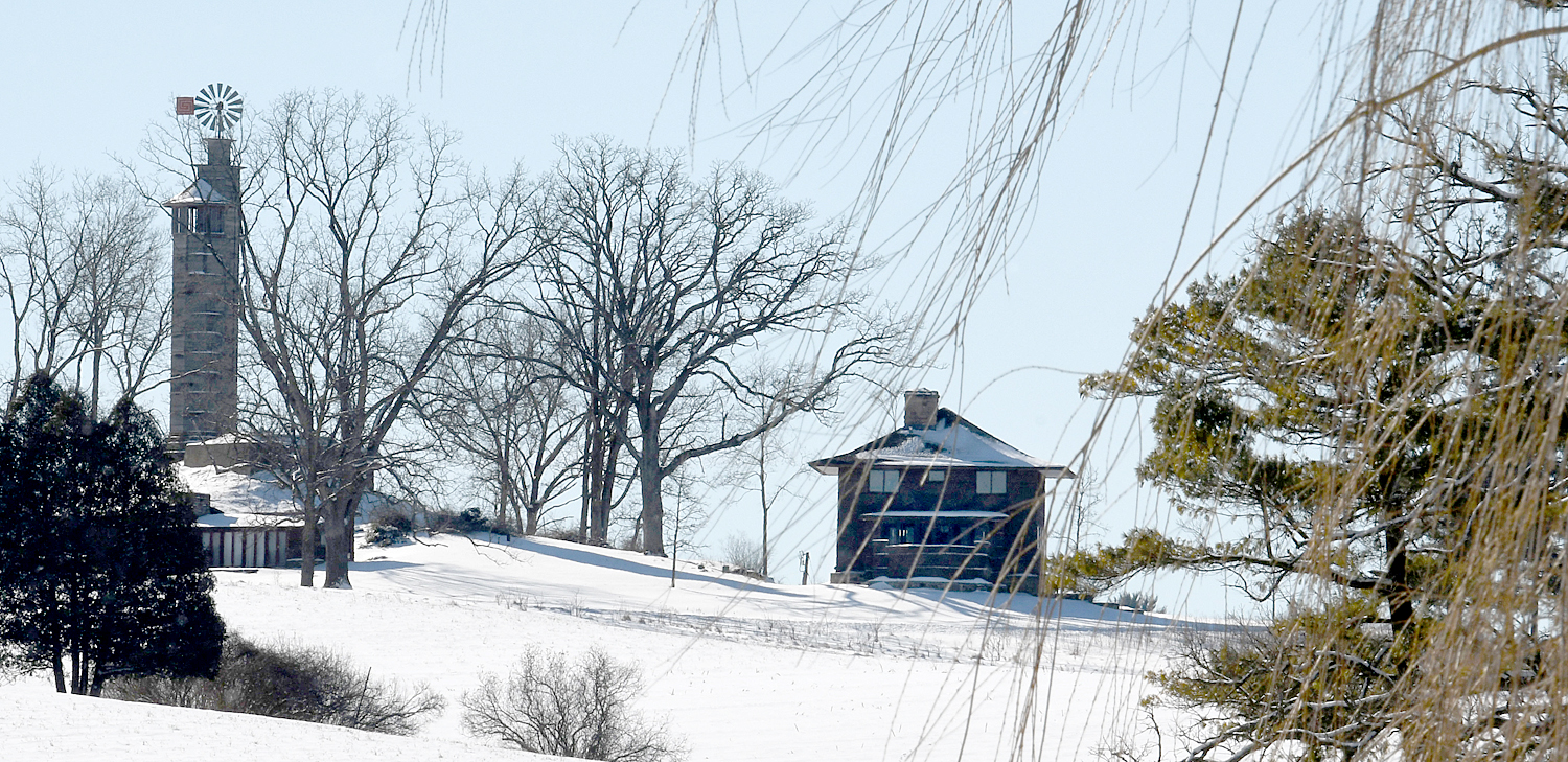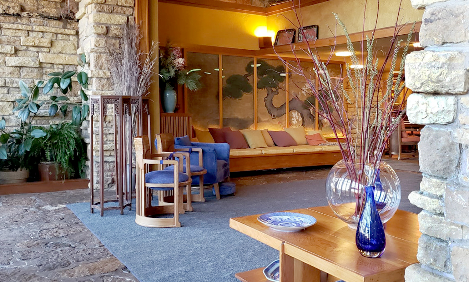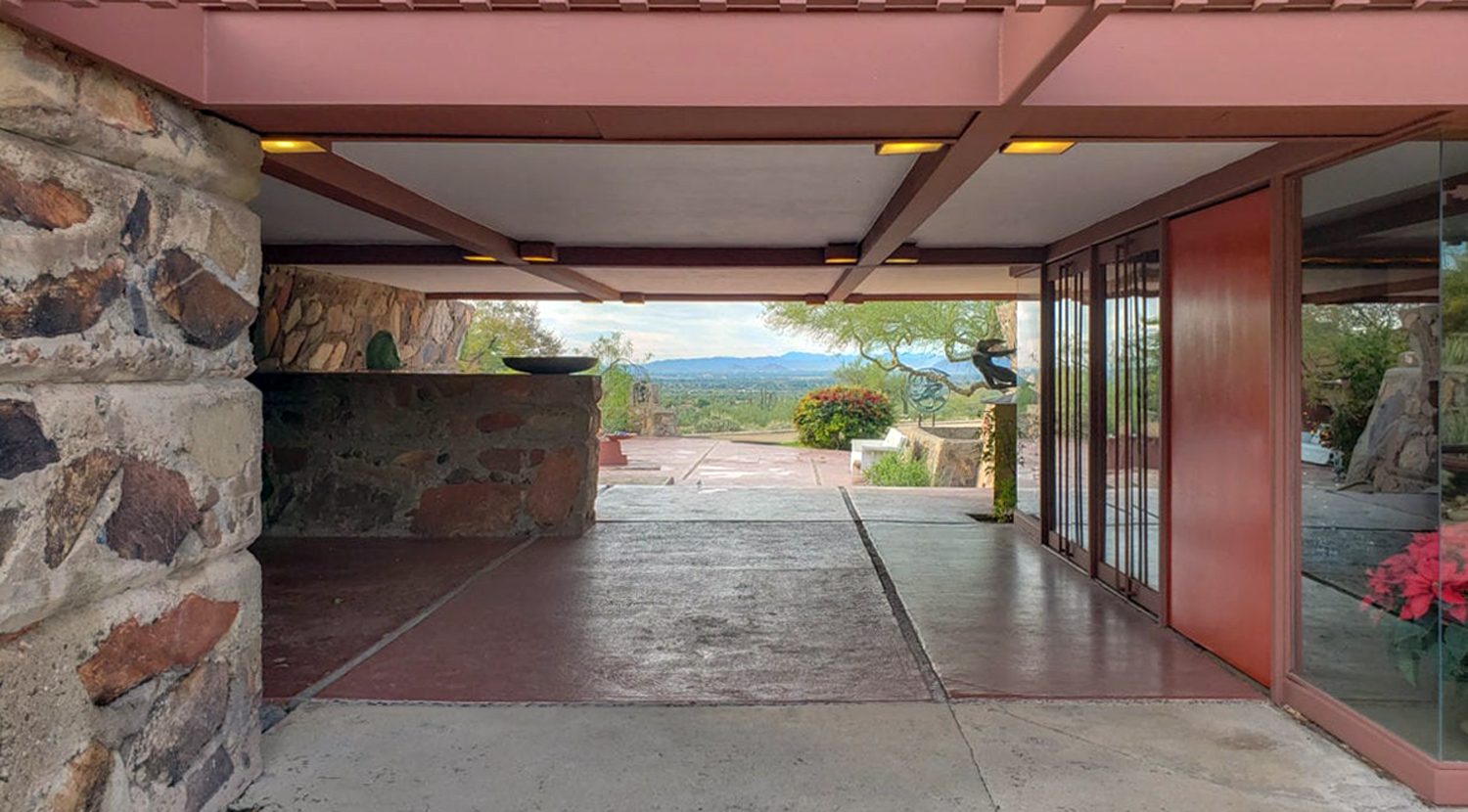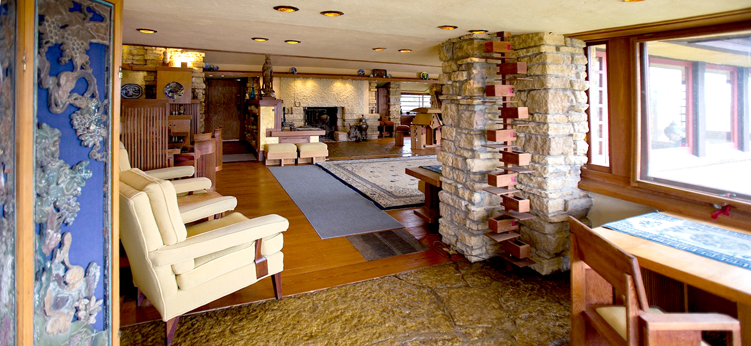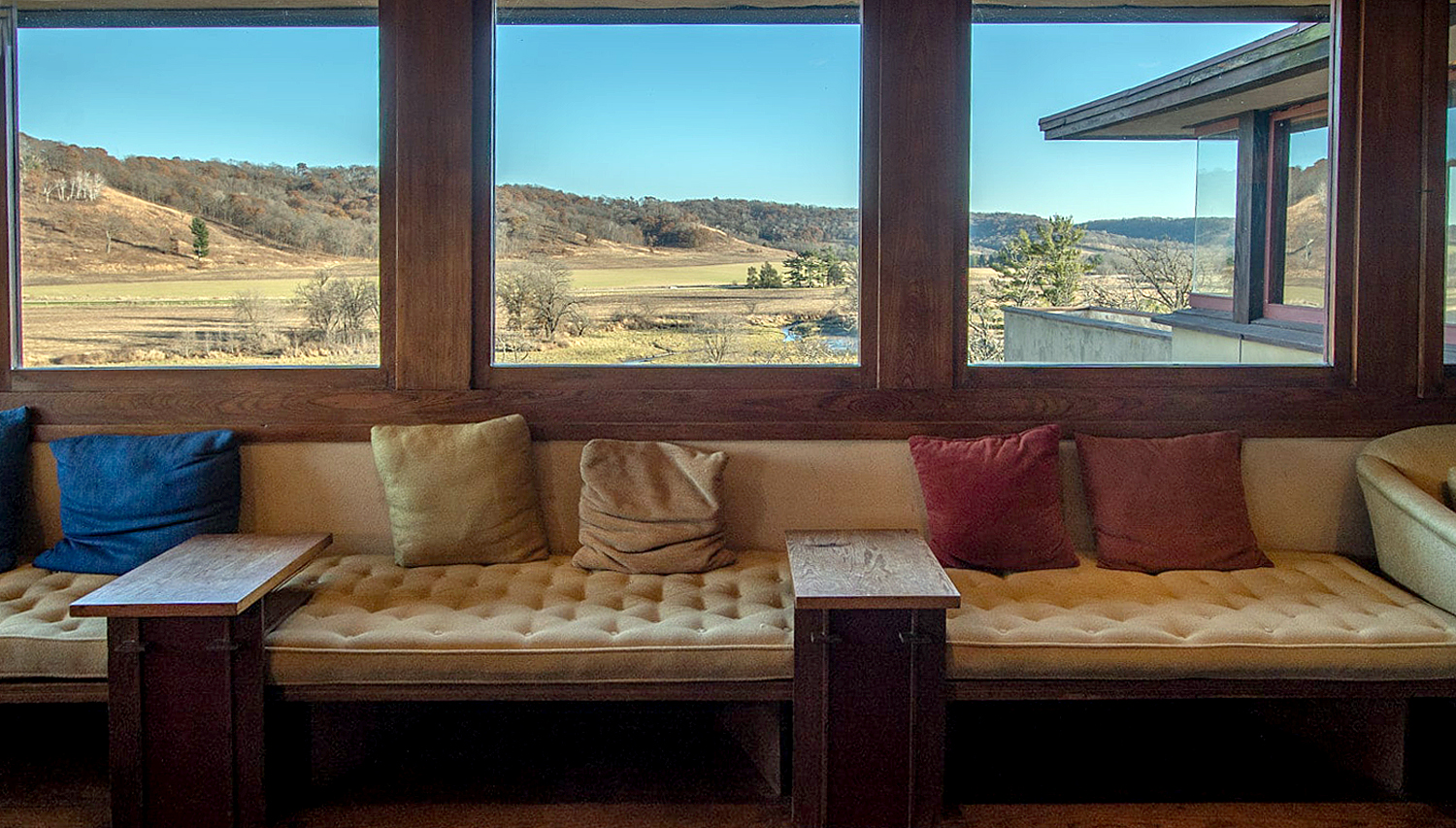 At that point, standing in the hallway just where it opens into the den, you can look to the north through the living room and see the Wisconsin hillsides; then turn to the east and see more through that room’s glass walls; then turn south and peek through the distant windows of Wright’s office and bedroom, to see the hillside with the house called Tan-y-deri and the windmill that pumped the estate’s water; then, finally, turn west and see the top of Taliesin’s hillside and the garden and greenery surrounding the tea circle where Wright and his apprentices met for discussion.