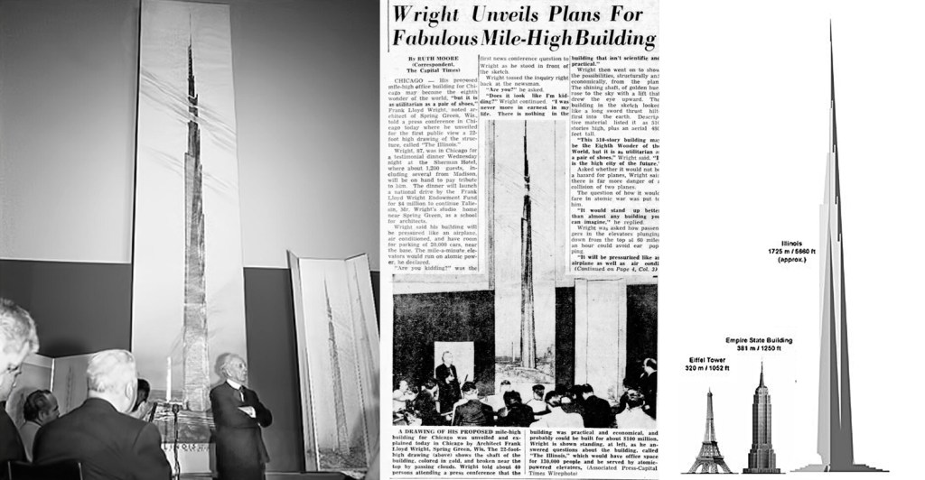 “Mile-high? Why stop there? Why not two miles, or even five miles, if need be?” he asked a friend. (The irony is that the Burj Khalifa, which is a quarter-mile high, was built in the desert, and although not designed by Wright, did borrow his plan for making the footprint of the building a triangle, giving it the stability of a tripod).