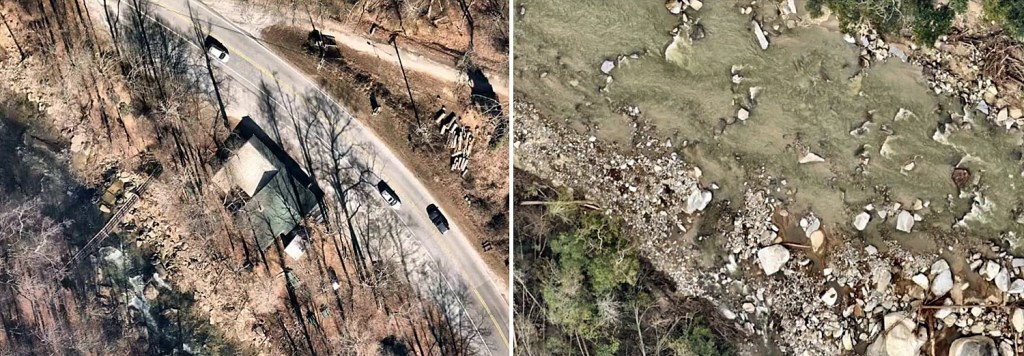That’s what happened along the Swannanoa River in the community of Swannanoa, along U.S. 70, where mountains both north and south dumped their drainage. Or along the French Broad River south of downtown Asheville, where the old industrial district, turned River Arts District, was wiped out. Or the narrow 14-mile Hickory Nut Gorge, which drops about 1,800 feet between the town of Gerton and Lake Lure, where much of the road is now reduced to a rocky creek bed.