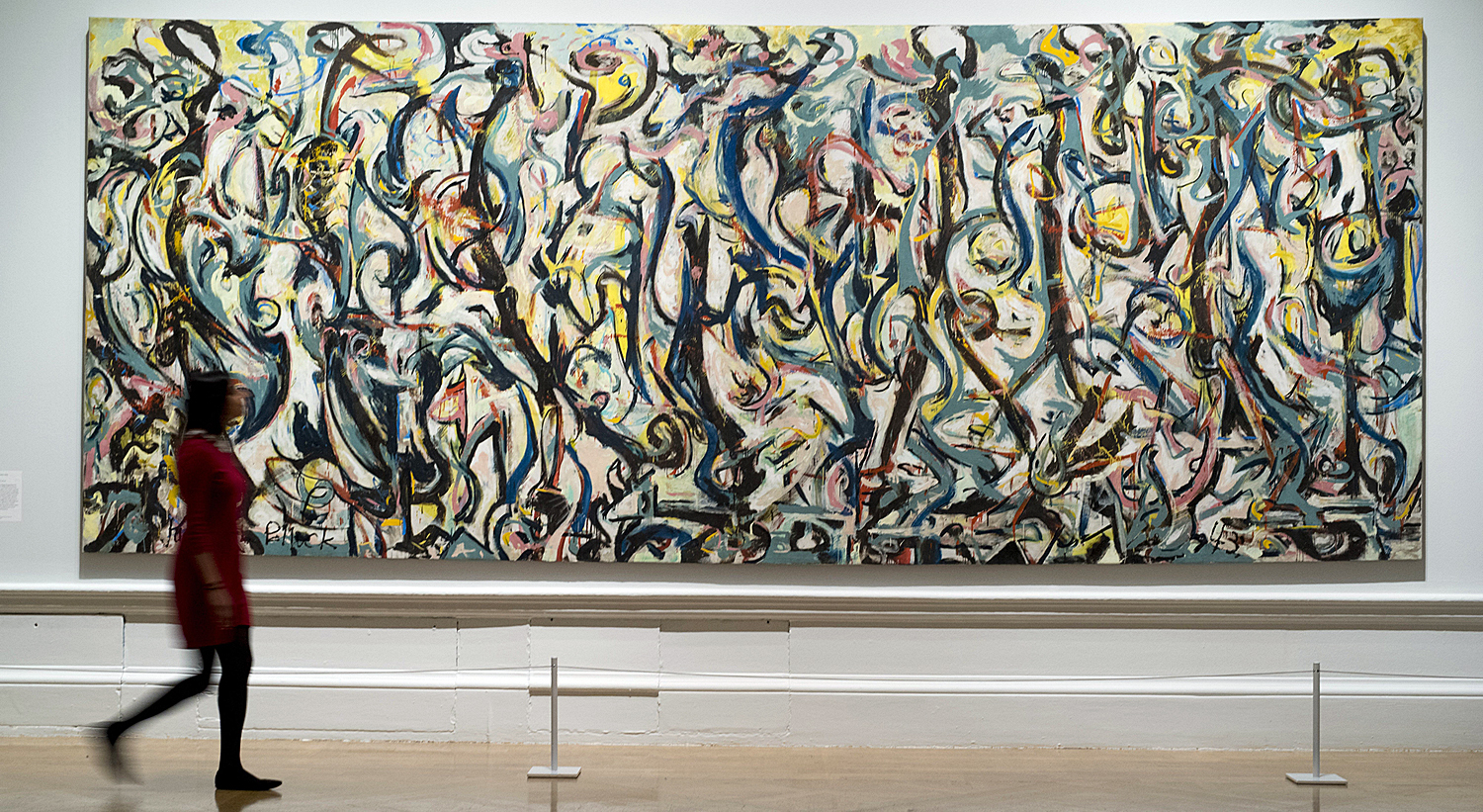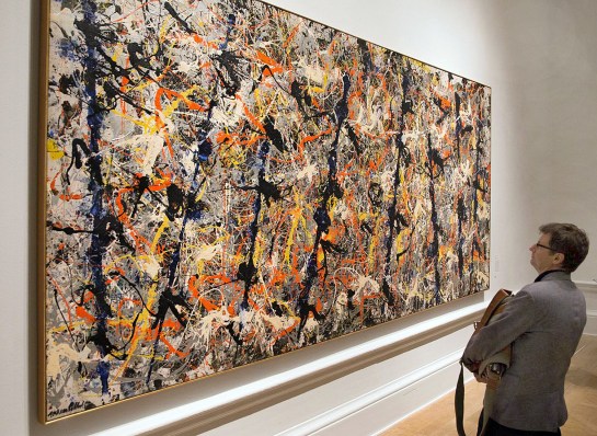 But those cigarette-smoking, heavy-drinking and blue-collar wearing guys at mid-century were dead serious. Jackson Pollock painted his first large painting, called Mural, in the mid-’40s. It is 8 feet by 20 feet and meant to be installed in the apartment of Peggy Guggenheim. It led to the later drip paintings that made Pollock famous — in 1949, Life magazine asked “Is he the greatest living painter in the United States?”