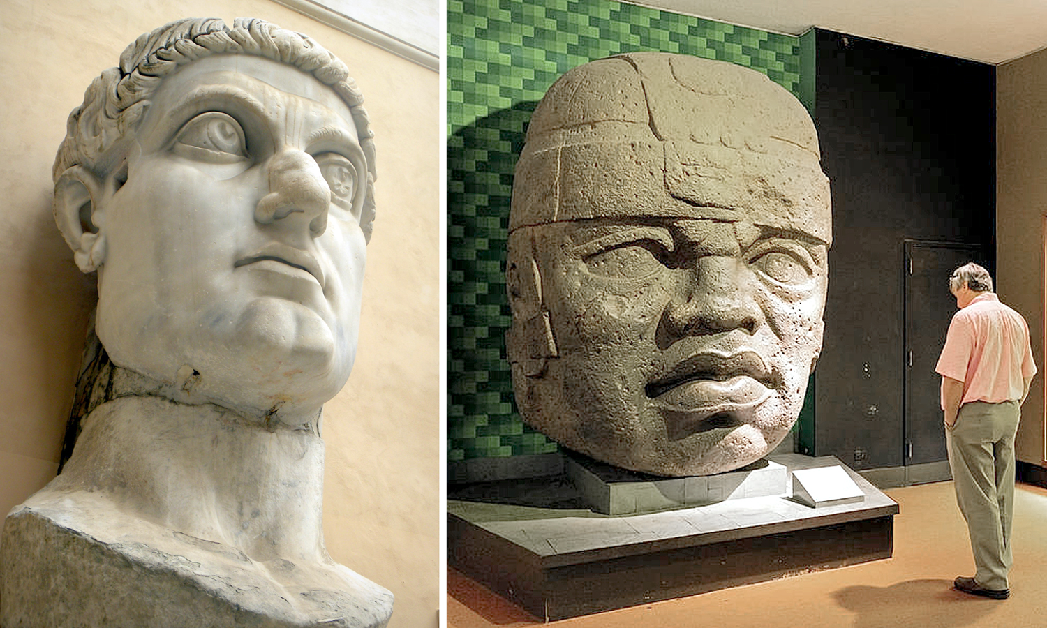 A giant head is another thing altogether, like the famous head of Emperor Constantine or one of the Olmec colossal stone heads from Mexico. Their size makes you take notice. The same shape, but the size of a cantaloupe, would hardly carry the power of these monuments. I remember the first time, as a boy, I saw the Olmec head at the American Museum of Natural History in New York; the memory of it stuck to my psyche for decades after. Still does.