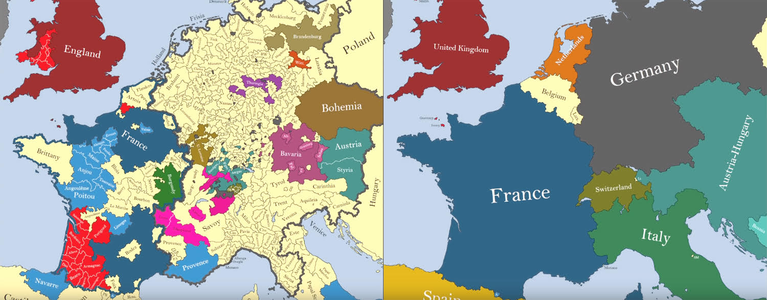 One of my favorites — In 1384, the Duchy of Brabant became Burgundian Netherlands; a century later, it became Habsburg Netherlands. Give another hundred years and it became Spanish Netherlands. In 1713, it became Austrian Netherlands followed in 1815 as the United Kingdom of the Netherlands, only to turn a few years later into what we now know as Belgium. There is a bubbling separatist movement that may turn the whole thing back into two countries: Wallonia and Brabant, bringing full circle.