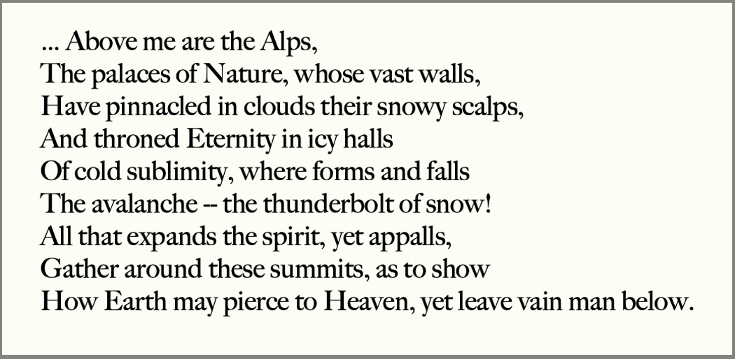 And Byron is nothing without The Sublime. He takes his doomed hero to the Jungfrau in Manfred and used it in Childe Harold’s Pilgrimage over and over, as in the lines, “Roll on thou deep and dark blue Ocean — roll!”