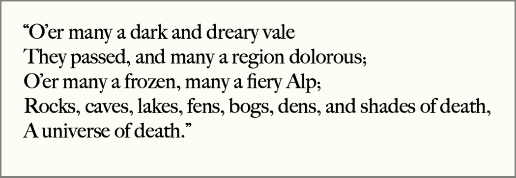 There had always been a subspecies of The Sublime in art. It is in Shakespeare, in Titian, in Rubens. It runs throughout John Milton’s Paradise Lost, especially in those parts describing Satan and his acts.