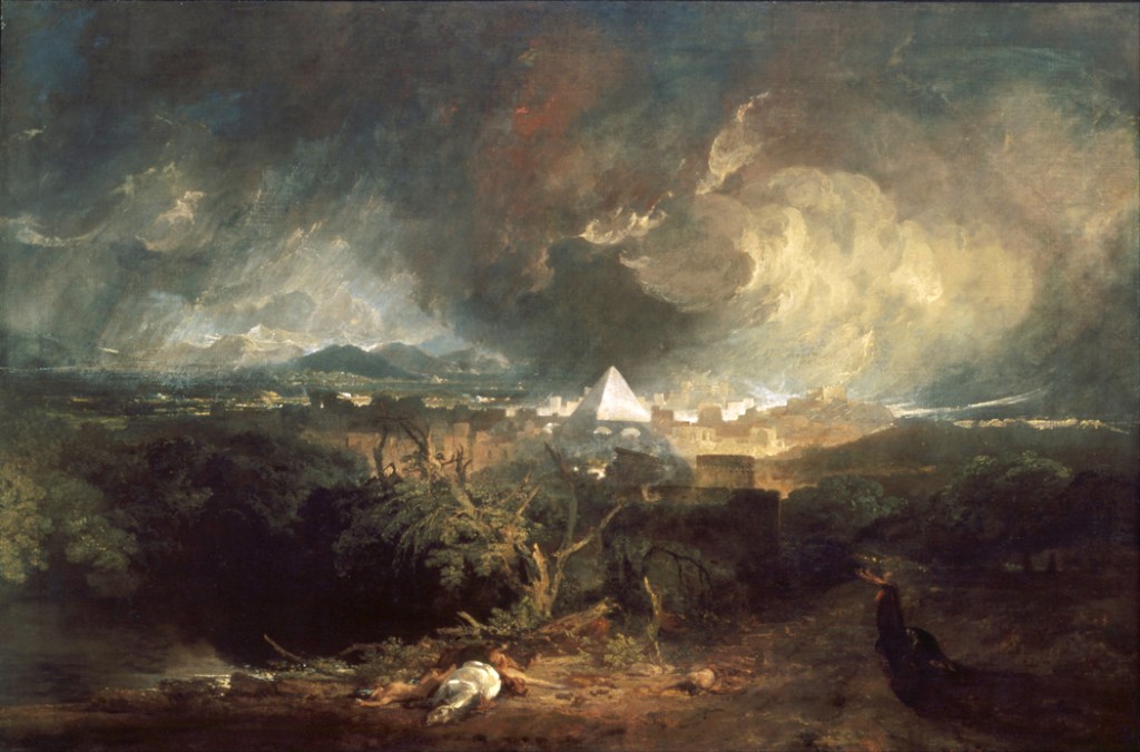 The biblical reference is apposite. Much of the imagery of The Sublime in the 19th Century comes from the Bible. Painters loved to depict certain scenes from the Old Testament: the Deluge; the Destruction of Sodom and Gomorrah; Balshazzar’s Feast; Samson destroying the temple of the Philistines; the Plagues of Egypt — anything that would have delighted Cecil B. Demille.